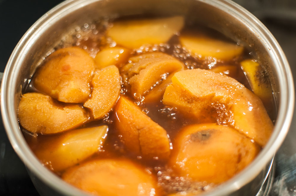 As the poaching liquid is heating, prepare your fruit. Peel them, quarter them, and cut out the tough and fibrous bits in the middle, especially in the quinces.