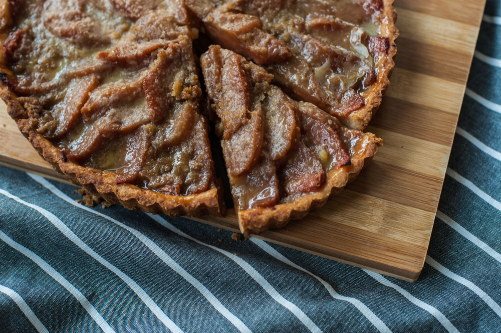 Quinces – why do you make it so hard for us to love you? Scoring almost as high as pomegranates on the “difficulty of preparation” vs “deliciousness of the payoff” scale, quinces can be quite rewarding for those who can get past the tough exterior, woody texture, and bitter flavour. The uncooked quince looks and tastes pretty unappealing. But bring the fruit to your nose, and you’ll get a hint of the hidden treasure waiting to be unlocked within. All it takes is some patience and a good batch of poaching liquid. For this tart, I put pears and quinces together (they’re botanical cousins, so they play well together) and used molasses and brown sugar to riff off of David Lebovitz’s original quince-poaching liquid. The result is a tart and an accompanying reduction that are redolent with the comforting, spiced flavours of autumn.