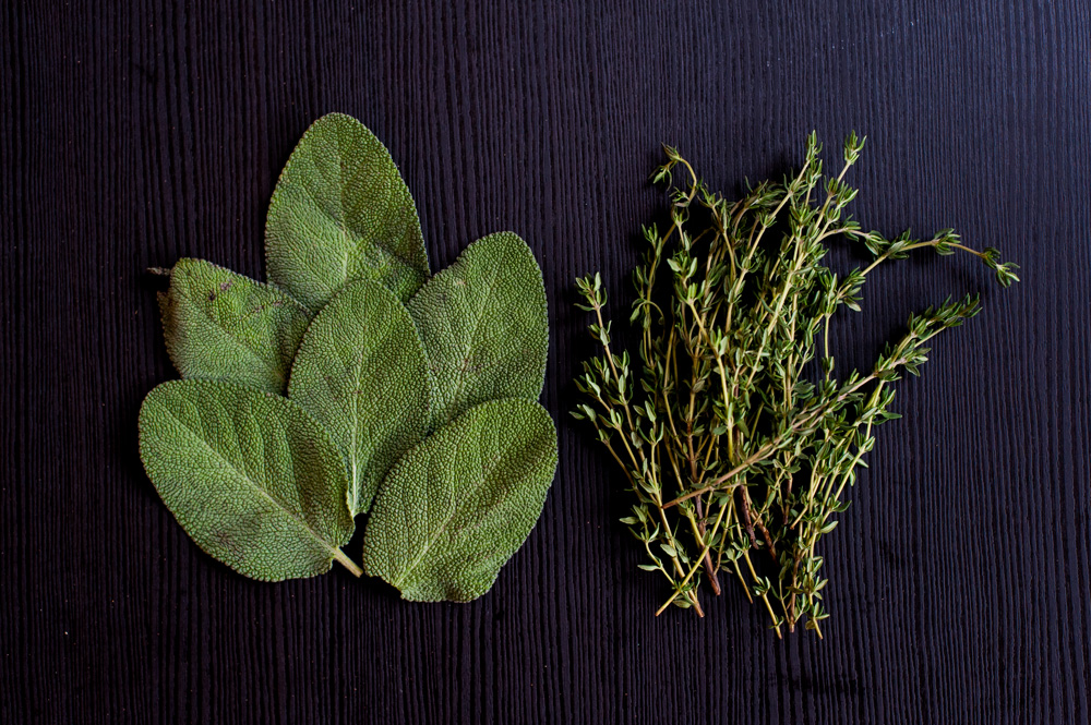 In a cast iron skillet over medium heat, add the butter, vegetables, 4-5 large leaves of sage, and a handful of thyme sprigs. Stirring occasionally, cook the vegetables for about 15-20 minutes until tender (for example, the onions should be translucent). Pick the sage leaves and thyme sprigs out of the skillet.